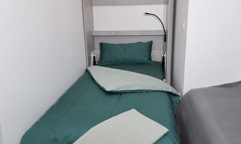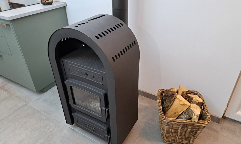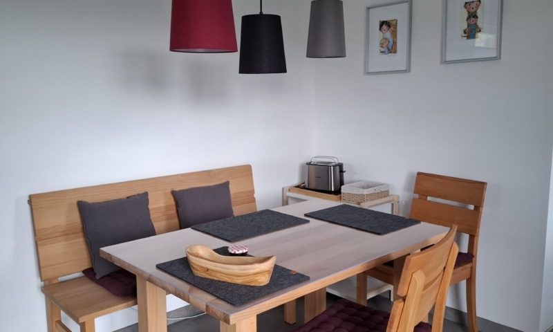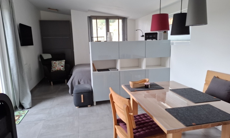 cuisine équipée, salle de bains (WC/douche italienne), espace de couchage séparé optiquement, une armoire-lit rabattable supplémentaire, coin salon, poêle à bois et terrasse ensoleillée, on est directement invité à se sentir bien.